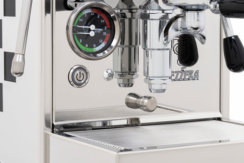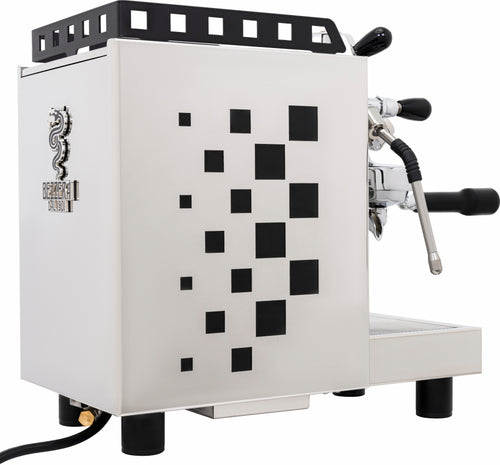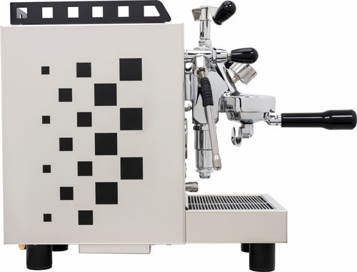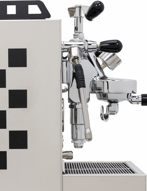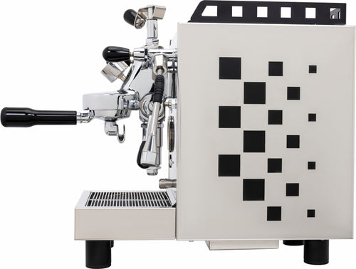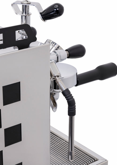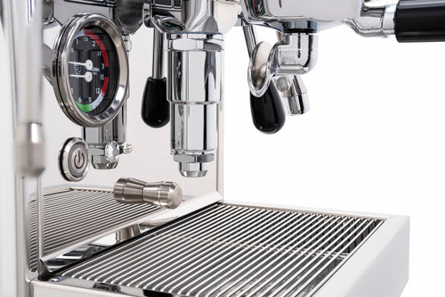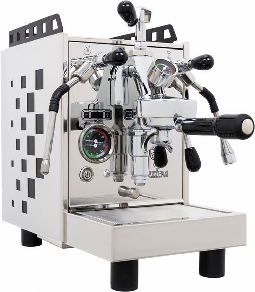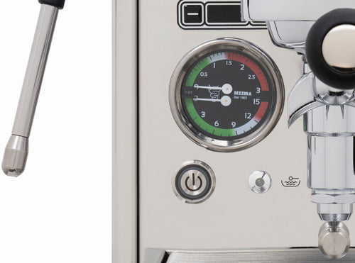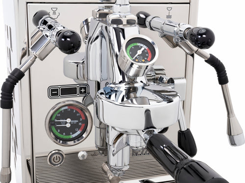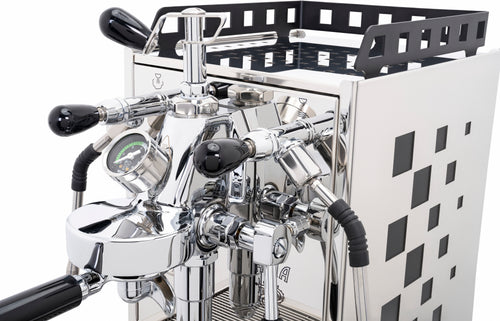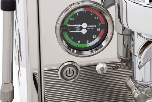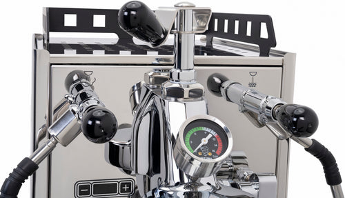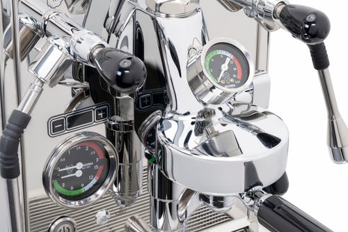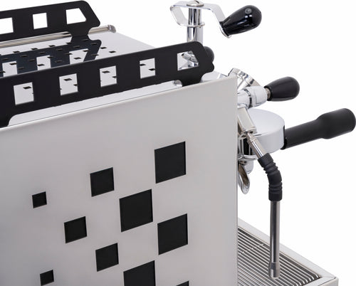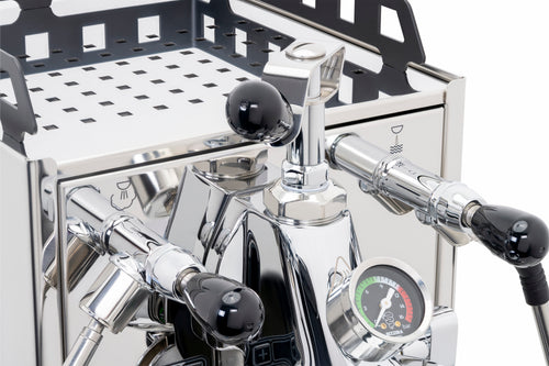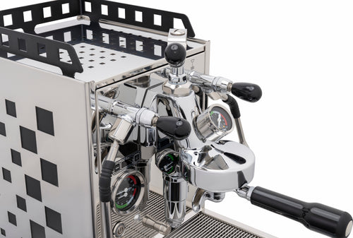 Dual pressure gauges make it easy to read the boiler and brew pressure, while unique box cutouts on the side panels add an extra touch of style.