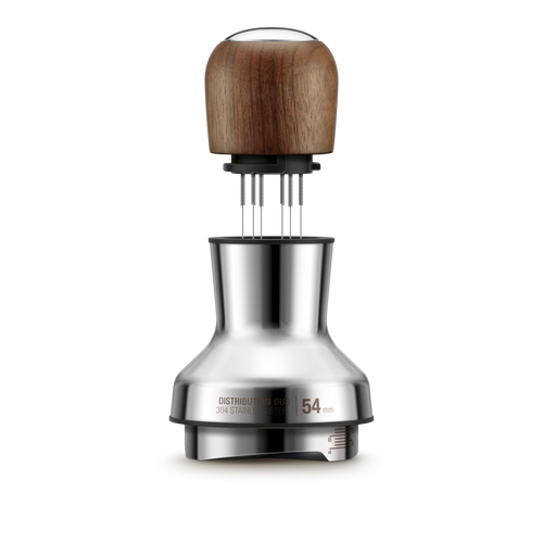 The Breville Distribution Duo 54mm is an indispensable tool for achieving the perfect espresso shot. This 2-in-1 accessory is designed to simplify your espresso preparation by combining distribution and tamping functions into one seamless tool.\n\n### Key Features:\n- **Dual Functionality**: Combines coffee distribution and tamping for optimal espresso extraction.\n- **Adjustable Depth Control**: Easily fine-tune the depth to match your desired coffee preparation.\n- **High-Quality Materials**: Crafted from stainless steel and premium walnut for durability and style.\n- **Compatible Design**: Specifically engineered for Breville machines with 54mm portafilters, including Barista Express, Barista Pro, and more.\n\n### Technical Specifications:\n- **Material**: Stainless steel with walnut finish\n- **Size**: 54mm\n- **Compatibility**: Breville 54mm portafilters\n\nWith the Distribution Duo, clumping becomes a thing of the past, leaving you with a smooth, even coffee bed and a perfect shot every time.