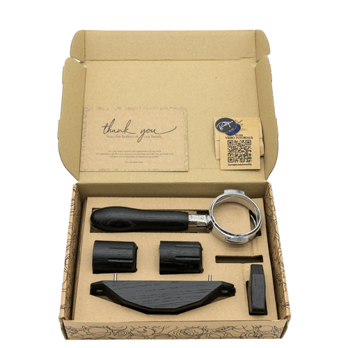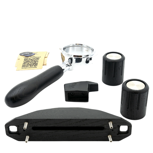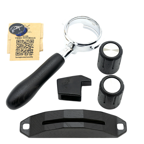 Each kit includes everything needed for a complete transformation: two ergonomic rotary wheels with perfectly matched wood grain, a beautifully crafted paddle frame and paddle, and an ergonomic portafilter handle. Every piece is hand-selected and finished to complement your machine's aesthetic while enhancing the tactile experience of pulling espresso shots.