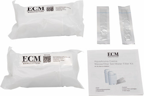 The ECM AquaAroma Crema water filter system is an essential accessory for maintaining your espresso machine's optimal performance and longevity. Each package contains two high-quality filter cartridges designed to integrate seamlessly with your machine's water tank, effectively preventing limescale buildup that can compromise both machine function and beverage quality.
