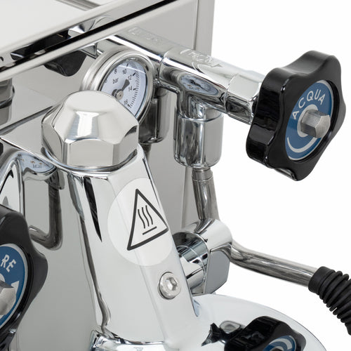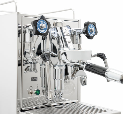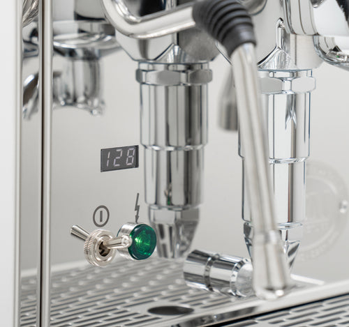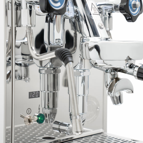 The Mechanika Slim PID features a discreet display that shows a shot counter and allows easy control of key functions. Users can activate or deactivate the preinfusion feature and toggle the ECO mode on or off, balancing energy efficiency with performance. The machine's compact stainless steel frame is enhanced by midnight blue accents on the steam and hot water valves, adding a touch of elegance to its timeless design.