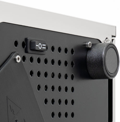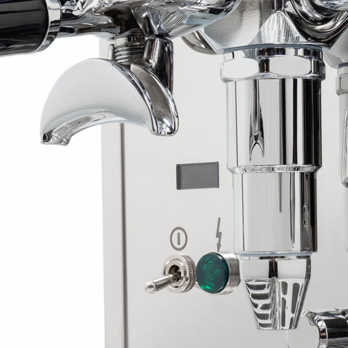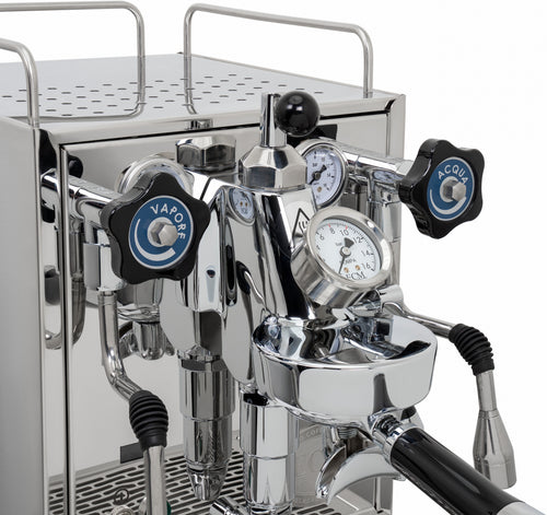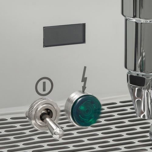The Mechanika Slim PID features a discreet display that shows a shot counter and allows easy control of key functions. Users can activate or deactivate the preinfusion feature and toggle the ECO mode on or off, balancing energy efficiency with performance. The machine's compact stainless steel frame is enhanced by midnight blue accents on the steam and hot water valves, adding a touch of elegance to its timeless design.