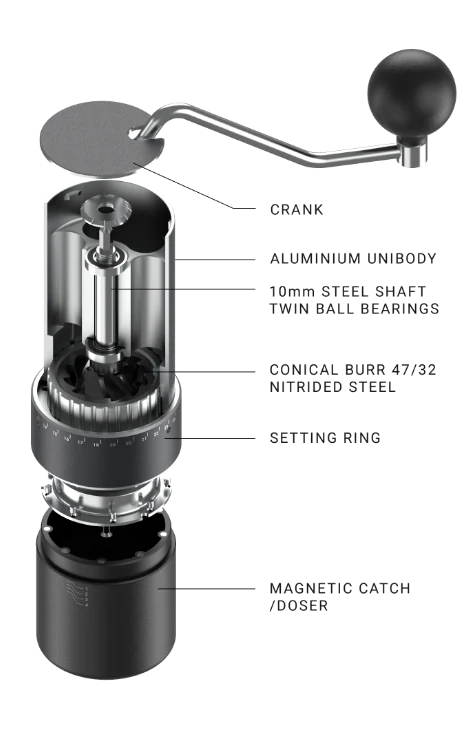 The Arco has a unique unibody design that ensures superb grind quality for every cup's sweeter, crisper, and clearer flavour. The single-dose grinder holds up to 50g of coffee at once and features nearly zero retention for less waste when adjusting your grind settings. Plus, it has an easy-to-use magnetic coffee catcher that fits perfectly into espresso machine portafilters for effortless dosing.