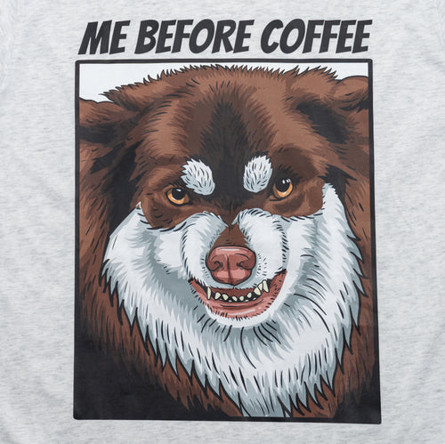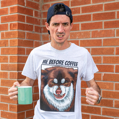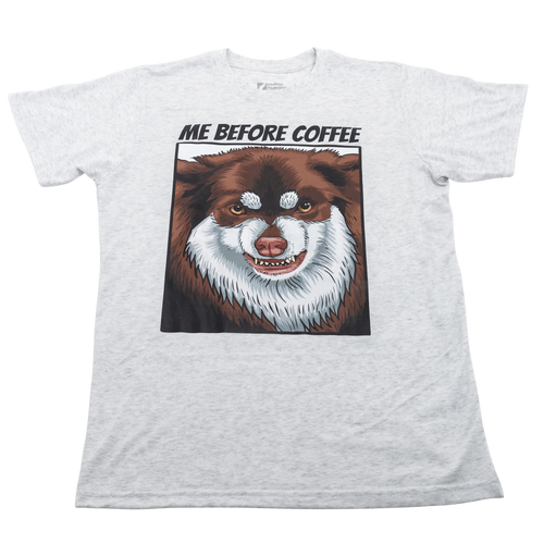 Fair warning, approach with caution! This heather grey tee features our beloved Head of Security showing exactly how we all feel before that first cup. The bold "ME BEFORE COFFEE" text paired with Whisky's perfectly captured morning face is basically a public service announcement.