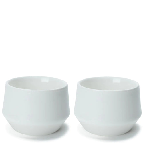 The cup is double-to-single walled porcelain, providing excellent thermal properties to keep coffee warm while remaining cool to the touch. Each cup has a capacity of 8.5oz (250ml) and measures 3.1 inches in height and width. They are also dishwasher-safe for easy cleaning.