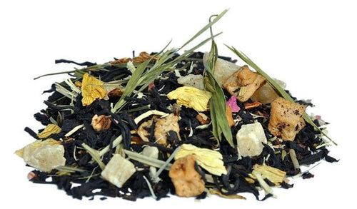 A magical blend of black tea and a mild melange of fruit, flowers and spices. A juicy and ripe experience, well balanced with Siberian ginseng. Ingredients : Black tea, candied pineapple(sugar), ascorbic acid, apple chunks, Siberian ginseng, bamboo leaves, lemongrass, peony petals, sunflower petals, lychee chunks, natural flavour