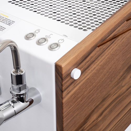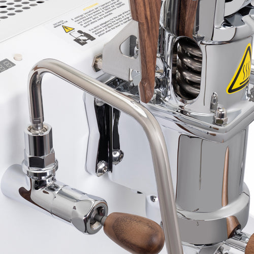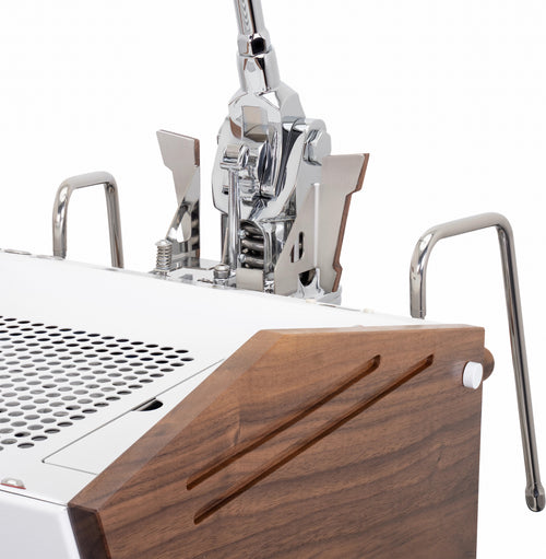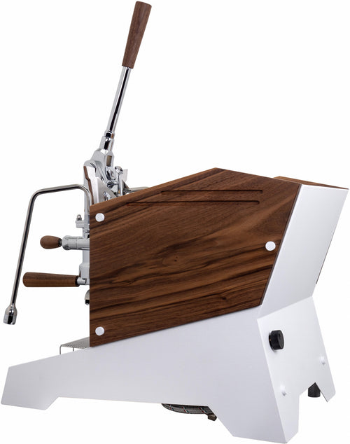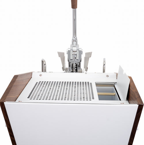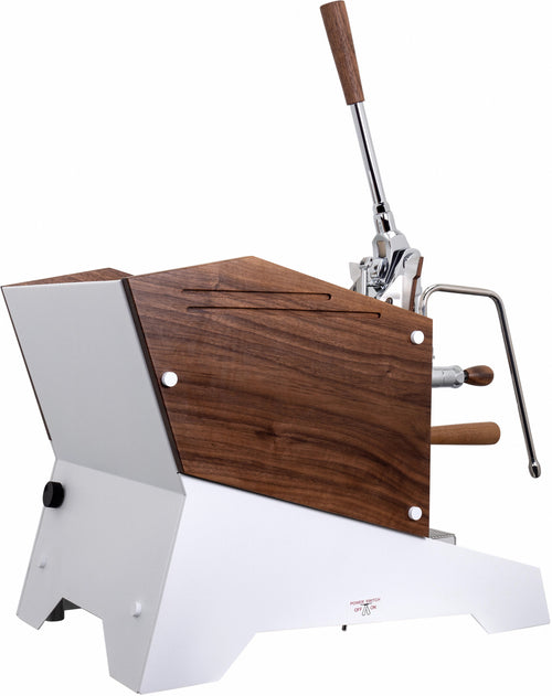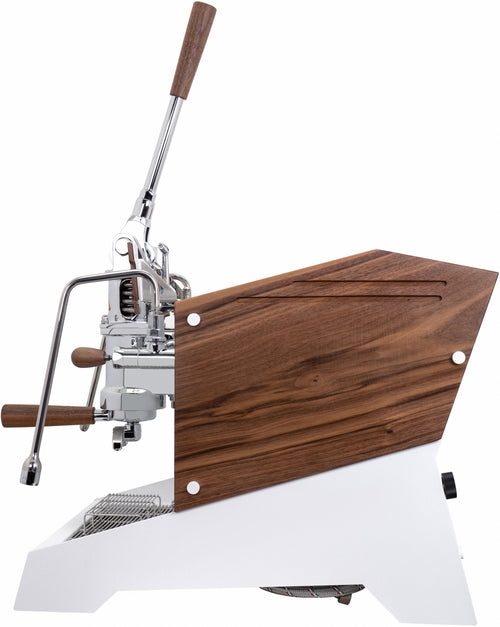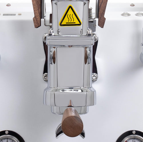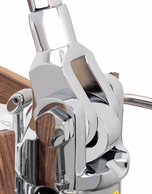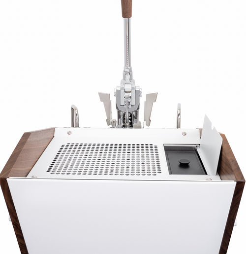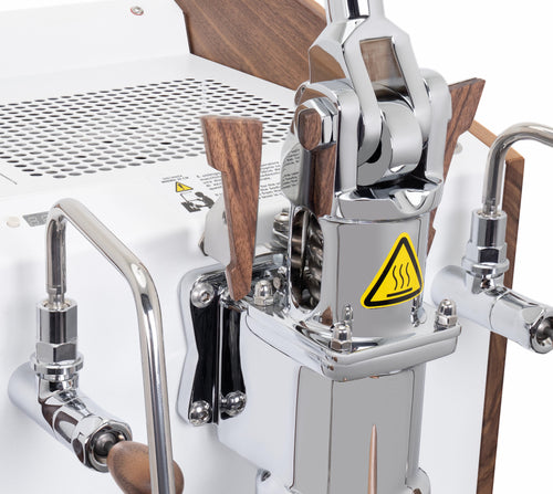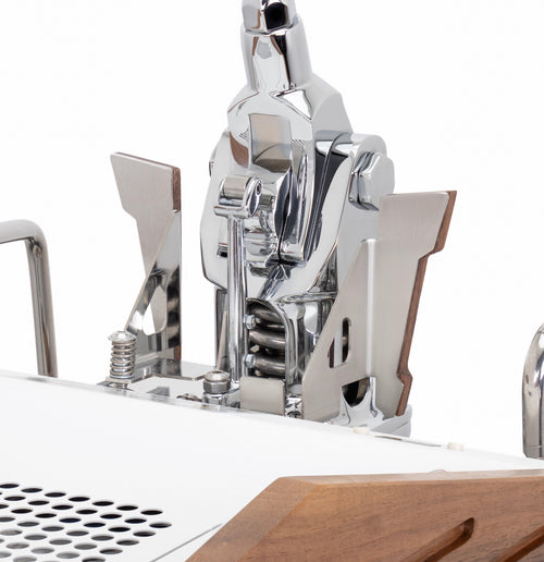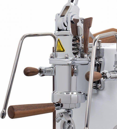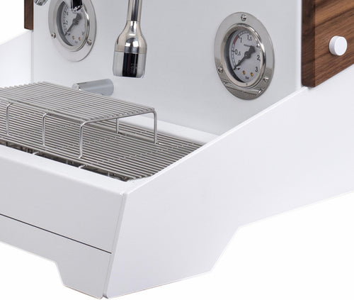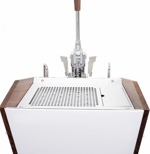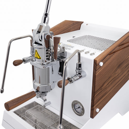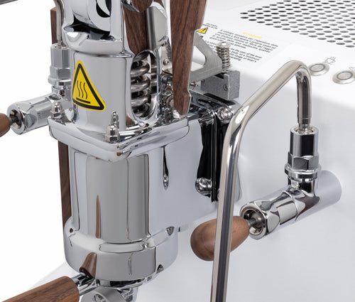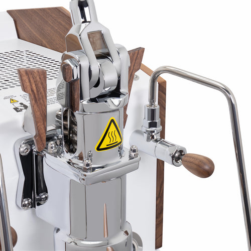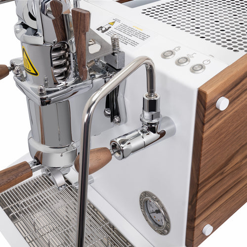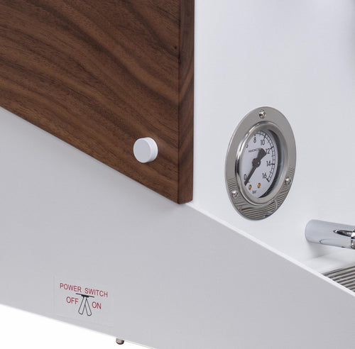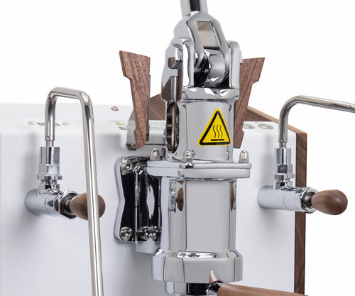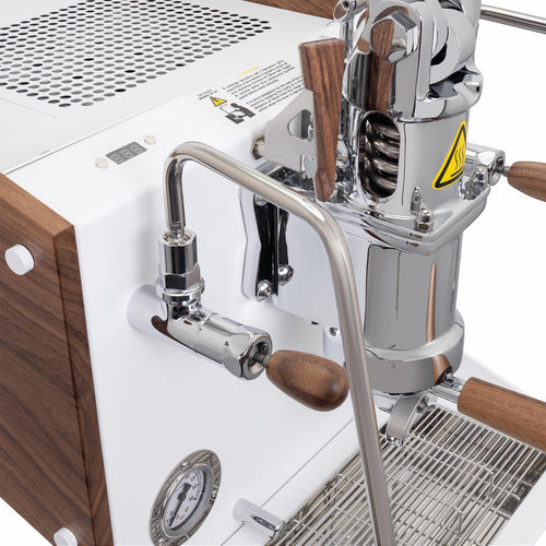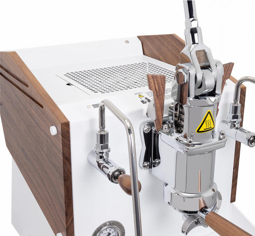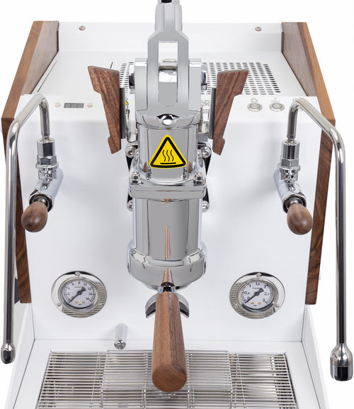 Featuring an active heating 54mm group head with three channel PID temperature regulating capability, 0.8L brew boiler and 1.8L steam boiler double boiler system with servo-assisted paddles for backflushing and preinfusion pressure adjustment. Moreover, its sleek design features a shiny stainless steel body (or optionally black and white coloured) combined with elegant walnut or zebra wood side panels; the machine is ready to brew within 15 minutes, and its rotary pump delivers water into the boiler without making a racket.
