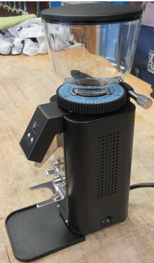 The grinder's intuitive digital interface allows precise timing adjustments down to 0.1 seconds, while the height-adjustable portafilter fork with quick-start functionality streamlines the workflow. The 250g hopper capacity strikes an ideal balance between counter space efficiency and practical usage. Its sleek matte black housing and branded front panel create a sophisticated aesthetic that complements any modern kitchen setup.