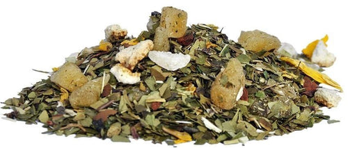 Awesome and energizing mate blend. Mate is loaded with antioxidants, vitamins and minerals. This tailored blend combines the sunny flavours of pineapple, citrus and mangosteen. Ingredients : Green mate, candied pineapple (sugar), ascorbic acid, candied mango (sugar), mango peel, citrus peel, natural flavour, sunflower blossoms.