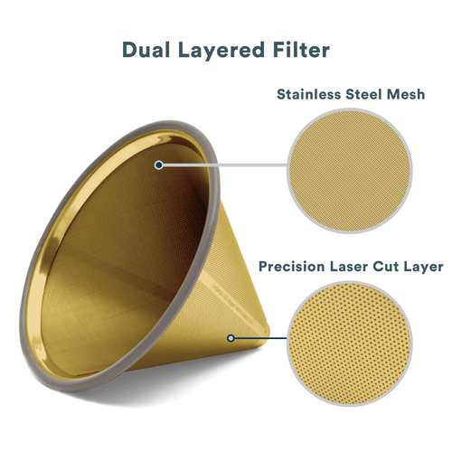 Superior quality 18/8 304 stainless steel with dual filter technology: a superfine high-quality mesh on the inside and a laser-cut filter on the outside.