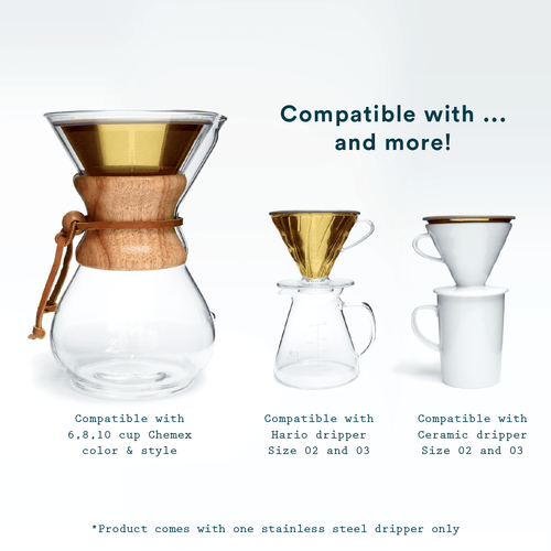 The Ovalware stainless steel dripper is carefully engineered to fit most branded coffee carafes including the 6, 8 and 10 cup Chemex coffee makers and Hario v60 02 and 03 drippers. Our removable BPA-free silicone grip complements your wooden or glass Chemex and grips the glass rim securely.