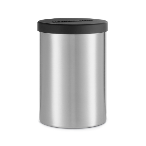 Store up to one pound of coffee beans in our Stainless Steel Coffee Canister, which features a brushed stainless steel finish and an airtight black silicone lid.