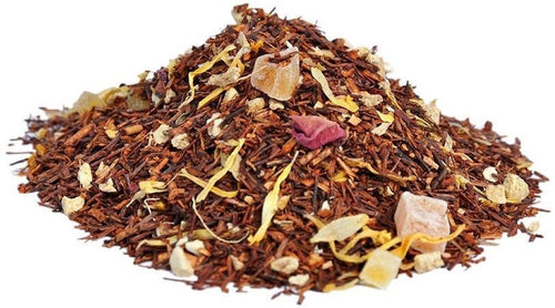 Full of flavour with a subtle spicy hint of ginger. A perfect combination of fruit and spice. This caffeine free rooibos blend works as well on a rainy day as it does iced pool side. High in antioxidants, vitamins and minerals. Great to boost the immune system. Ingredients : Rooibos, mango peel, candied mango (sugar), ginger, natural flavour.