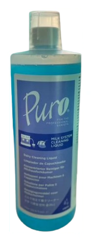 When maintaining hard-to-clean milk systems, professionals use Puro Liquid Dairy Cleaner. This product is an essential part of the cleaning regimen because it removes baked-on milk residue from steam wands, valves, and tubes. When allowed to develop over time on your equipment, milk residue breeds unwanted bacteria. Puro Liquid Dairy Cleaner is effective on both automatic milk frothers and manual steam wands. An essential component of daily machine maintenance, Puro Liquid Dairy Cleaner contains food-safe blue for a visual cue. This traditional liquid formula is easy to use and each bottle comes with a convenient dosing cap.