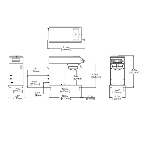 The Brewer is perfect for use in quick turn environments where high-quality coffee is continuously refreshed. The product dimensions are H 17.9"" W 9.0"" D 18.5"". The funnel type is black plastic, and the faucet location is upper. The product warranty is not mentioned.